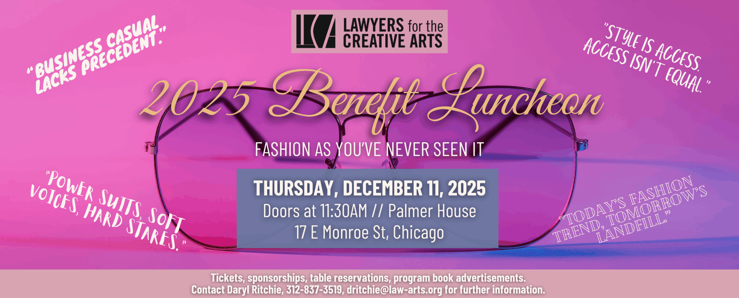 By submitting this form, you are consenting to receive marketing emails from: Lawyers for the Creative Arts, 161 N Clark St., Suite 4200, Chicago, , IL, 60601, US, http://www.law-arts.org. You can revoke your consent to receive emails at any time by using the SafeUnsubscribe® link, found at the bottom of every email.Emails are serviced by Constant Contact.