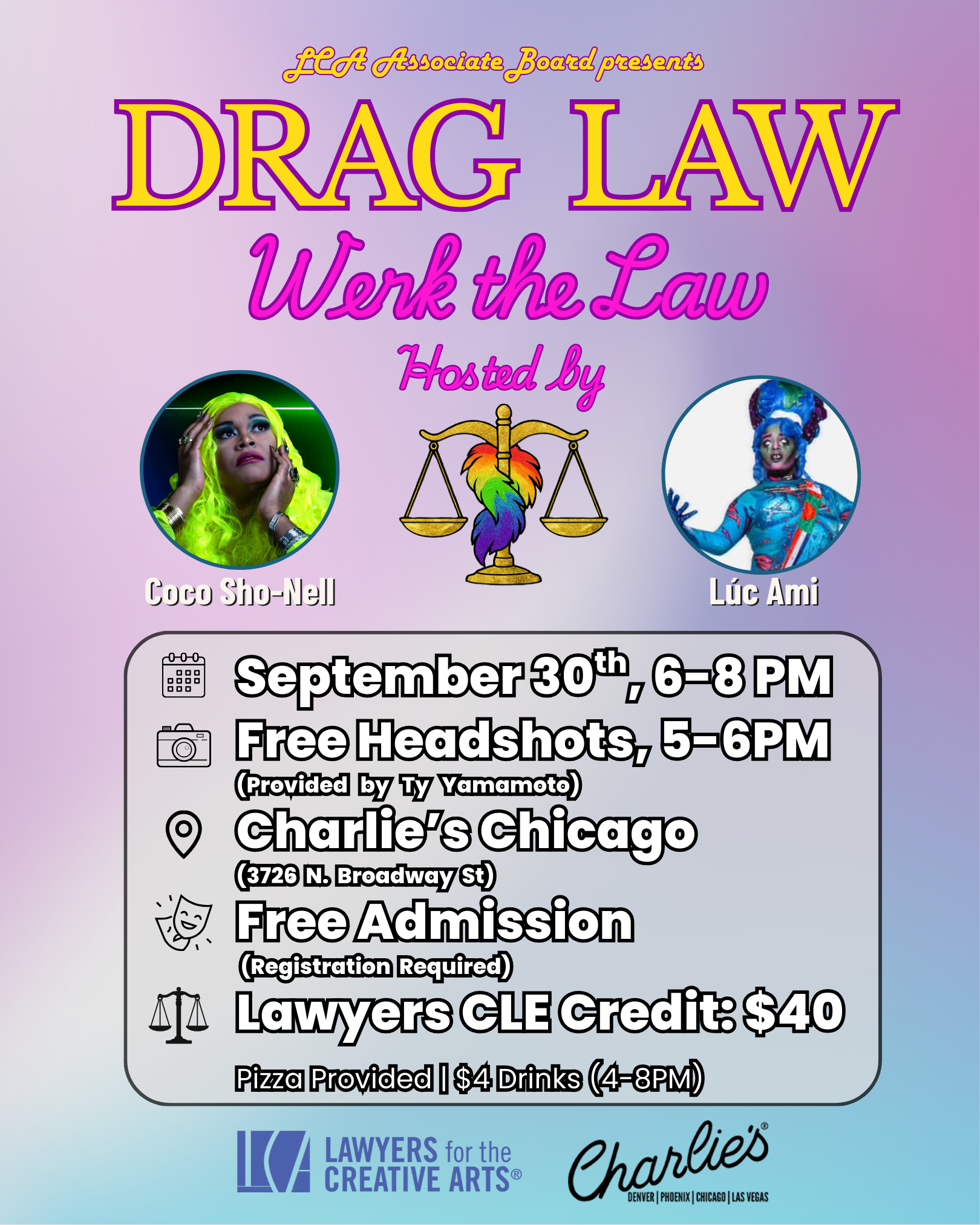 The courtroom meets the catwalk on September 30th (6–8 PM) at Charlie’s Chicago, as Lawyers for the Creative Arts invites you to Drag Law. Hosts Coco Sho-Nell and Luc Ami guide us through a dazzling mix of drag performance and practical legal insight. Between showstopping numbers, we’ll break down the laws that shape artistic expression in drag and burlesque—covering everything from contracts and parodies to rights of publicity and performer protections. Whether you’re a lawyer, an artist, or an ally, this program promises to keep you informed, entertained, and empowered. Because let’s be honest: Legal Issues Never Looked This Good. This event is open to those 21+ Additionally, Community headshots, provided by @ty_yamamoto1, will be available from 5:00–6:00 PM on a first-come, first-served basis. Each session will last about five minutes, and participating artists will receive one complimentary headshot! Event Highlights Hosted by Coco Sho-Nell & Luc Ami Legal topics: contracts, parody, right of publicity & more Free Admission | CLE Credit for Lawyers: $40 Pizza on us | $4 drink specials (4–8 PM) Why Attend? For Artists & Performers: Learn how the law impacts your creative work and how to protect yourself on and off stage. For Lawyers: Earn CLE credit in a lively, unconventional setting (that’s anything but boring). For Everyone: Celebrate free expression, fabulous performance, and the right to remain fabulous. Adam Reis, Intellectual Property Attorney Amanda Burns, Caffarelli & Associates Ltd. Joshua Pagan, Mudd Law Brett A. Manchel, Associate, Pattishall McAuliffe