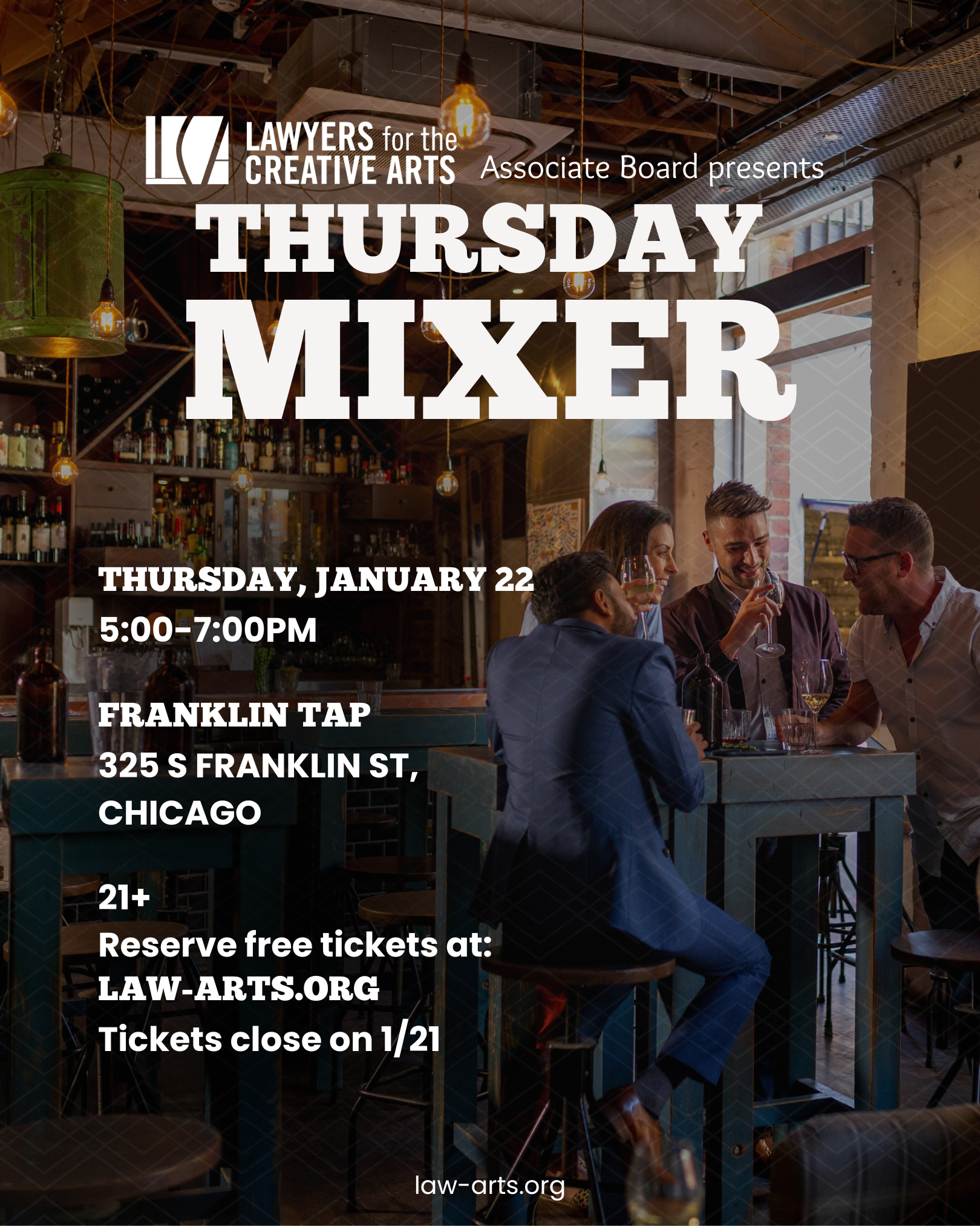 Join the Lawyers for the Creative Arts’ Associate Board for a new monthly tradition: Third Thursdays! Each month, representatives from the Associate Board and LCA staff will host an informal meet-and-greet at different locations across the city—creating opportunities for networking, collaboration, and community building. This month we will be at Franklin Tap! Whether you want to connect with AB members and LCA staff, explore partnership opportunities with LCA, or even pitch your space as a future Third Thursday location, this is a great way to engage with and celebrate Illinois’ vibrant artistic community. Interested in joining the Associate Board? We’d love to welcome you! Please review our Associate Board Packet and Application here: Associate Board Packet & Application. Once you’ve submitted your application to our Director of Operations and the current Associate Board President, you can complete your membership by paying dues for the current cycle here: LCA Associate Board Dues | 2026. We’d love to welcome you into the LCA Associate Board community!